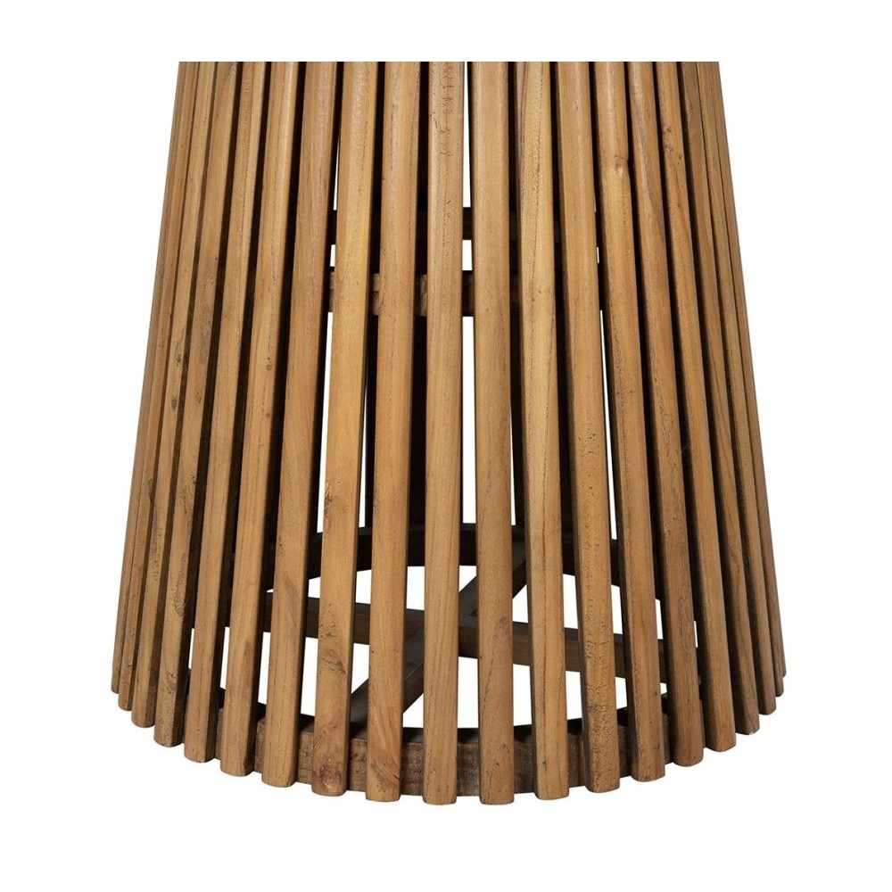 Entdecken Sie den Esstisch Camille, der vollständig aus natürlichem Ulmenholz gefertigt ist. Sein Design zeichnet sich durch einen eleganten und originellen Mittelfuß aus Lamellen aus, der von einer passenden runden Tischplatte gekrönt wird. Ein praktisches und zugleich ästhetisches Stück, das Ihrem Essbereich Charakter verleiht.