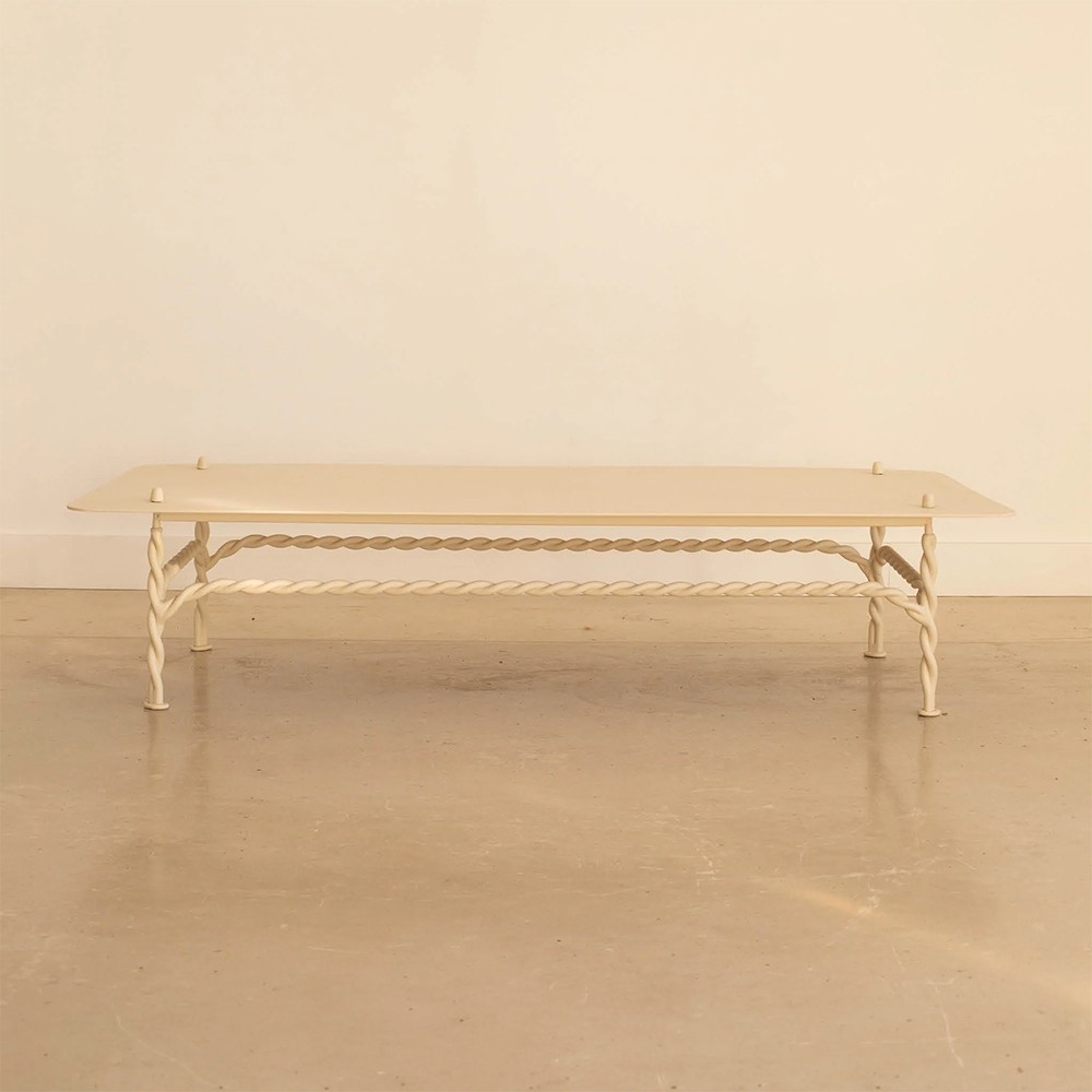 Der Tisch wird in ungebleichtem Eisen hergestellt, kann aber auch in braunem Eisen gefertigt werden, ganz nach Ihren Wünschen. Seine dünne Tischplatte verleiht ihm eine optische Leichtigkeit, die im Kontrast zum Charakter des gedrehten Eisens steht.