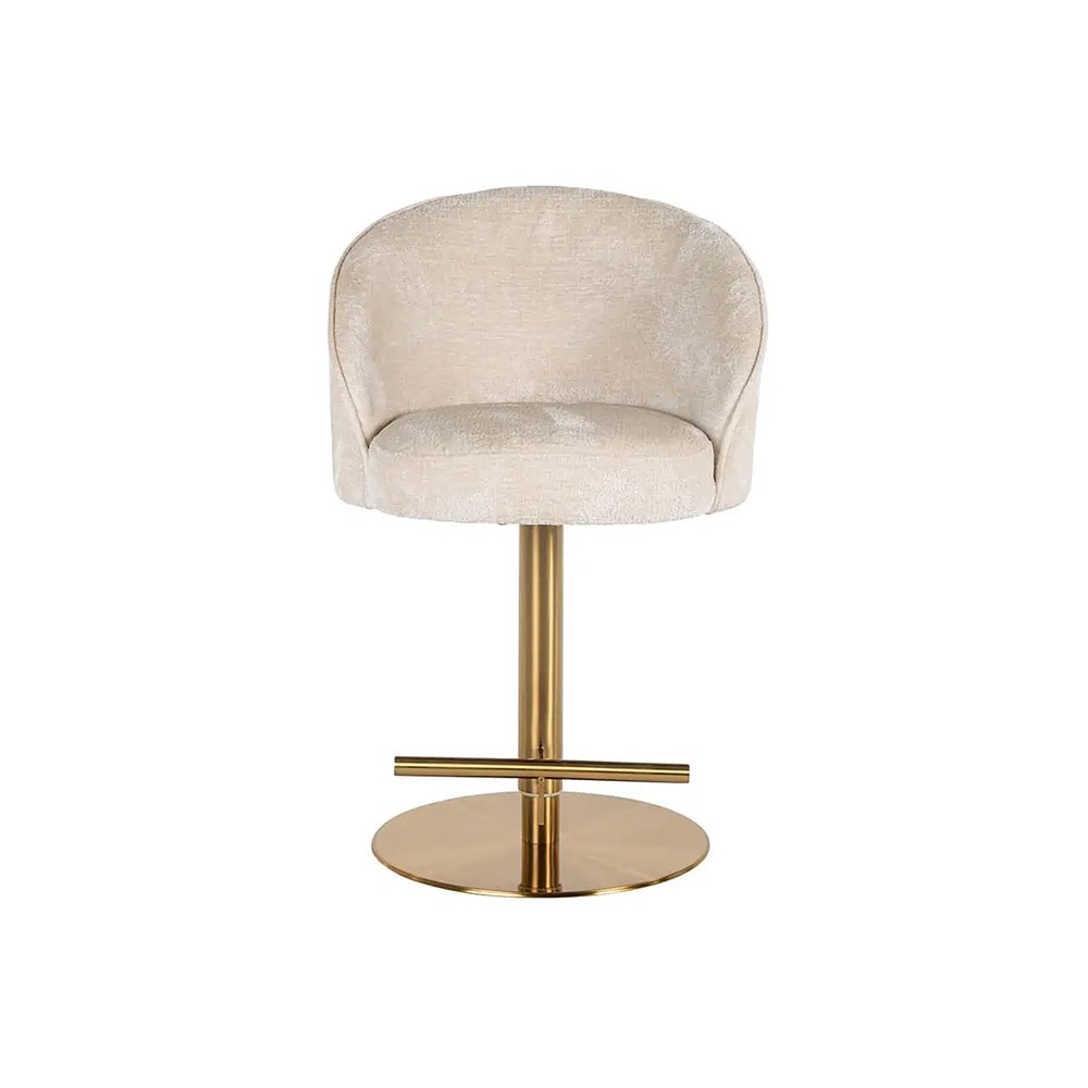 Der Hocker Zabi mit seinem raffinierten Chenille-Stoff und dem schicken goldenen Gestell besticht durch seine moderne Eleganz und seine bequeme Sitzfläche. Er ist der perfekte Begleiter für Ihre Mahlzeiten und veredelt Ihre Einrichtung.