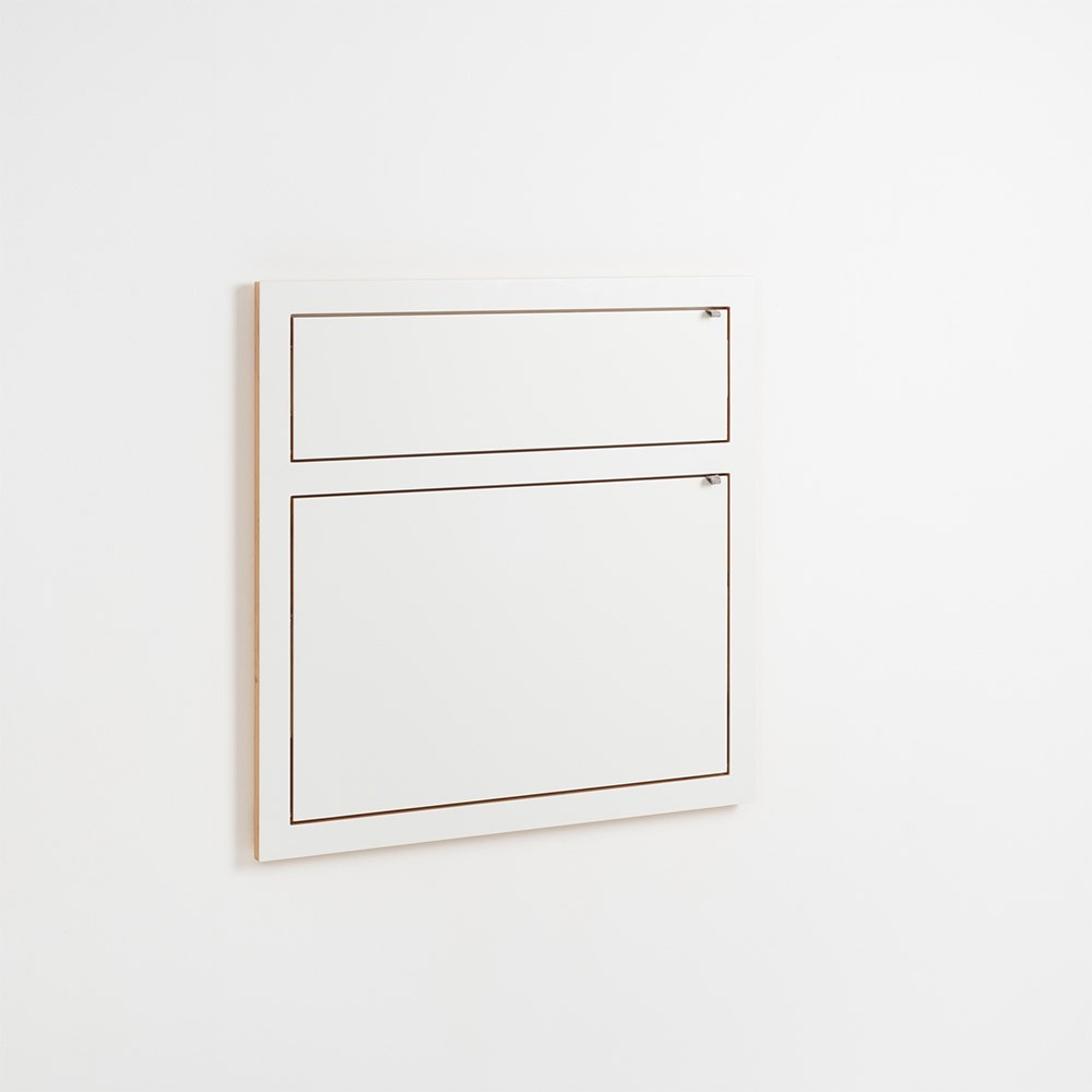 Funktionell und diskret ist der weiße Klappwandschreibtisch Fläpps 80x80 ideal für kleine Wohnräume! Es passt sich Ihren Wünschen und Bedürfnissen an: eine sitzende oder stehende Arbeitsstation, abhängig von der Höhe, in der Sie es an der Wand befestigen.