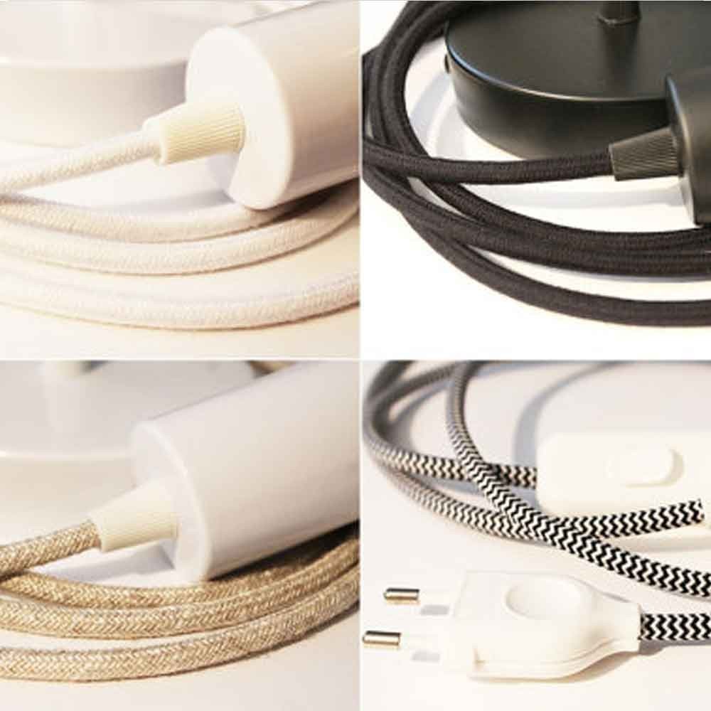 - Kabelset: Enthält eine Fassung und eine Rosette aus Metall sowie ein 2 m langes Textilkabel. Verwenden Sie nur Energiesparlampen oder LEDs.
