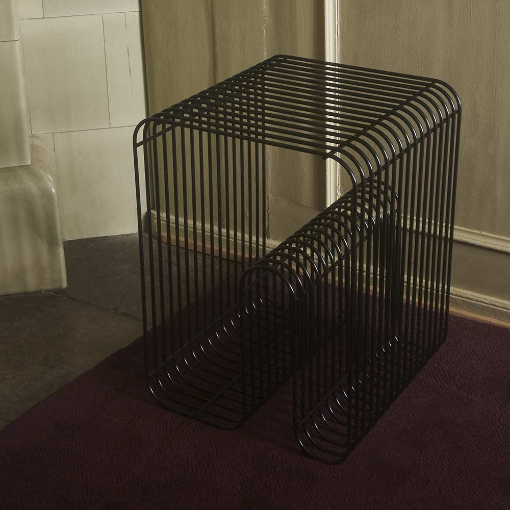 Im Art-Deco-Stil ist der schwarze Curva-Hocker ein wahres Kunstwerk. Seine Eisenstangen tanzen zu einem prächtigen Objekt, das den Raum mit Eleganz und Raffinesse einnimmt. Die abgerundeten und verdrahteten Formen sind das Markenzeichen der Curva-Kollektion von AYTM.
