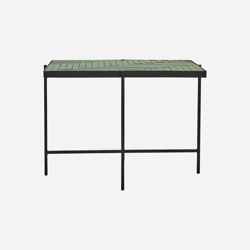 Erhöhen Sie Ihren Wohnraum mit diesem handgefertigten Beistelltisch mit einer Tischplatte aus leuchtend grünen Keramikfliesen, die einen wunderschönen Kontrast zu einem eleganten schwarzen Eisenrahmen bildet. Jedes Stück weist einzigartige Farbvariationen auf, die einen unverwechselbaren Charakter und Charme hinzufügen.