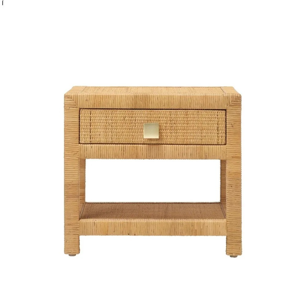 Die Rattanmöbelkollektion Saigon wird um einen Nachttisch erweitert, dessen Design von den grafischen Linien der 40er Jahre inspiriert ist und mit den anderen Stücken der Serie harmoniert. Sein Stil zeichnet sich durch ein raffiniertes Rattan-Geflecht und einen eleganten Messinggriff aus.
