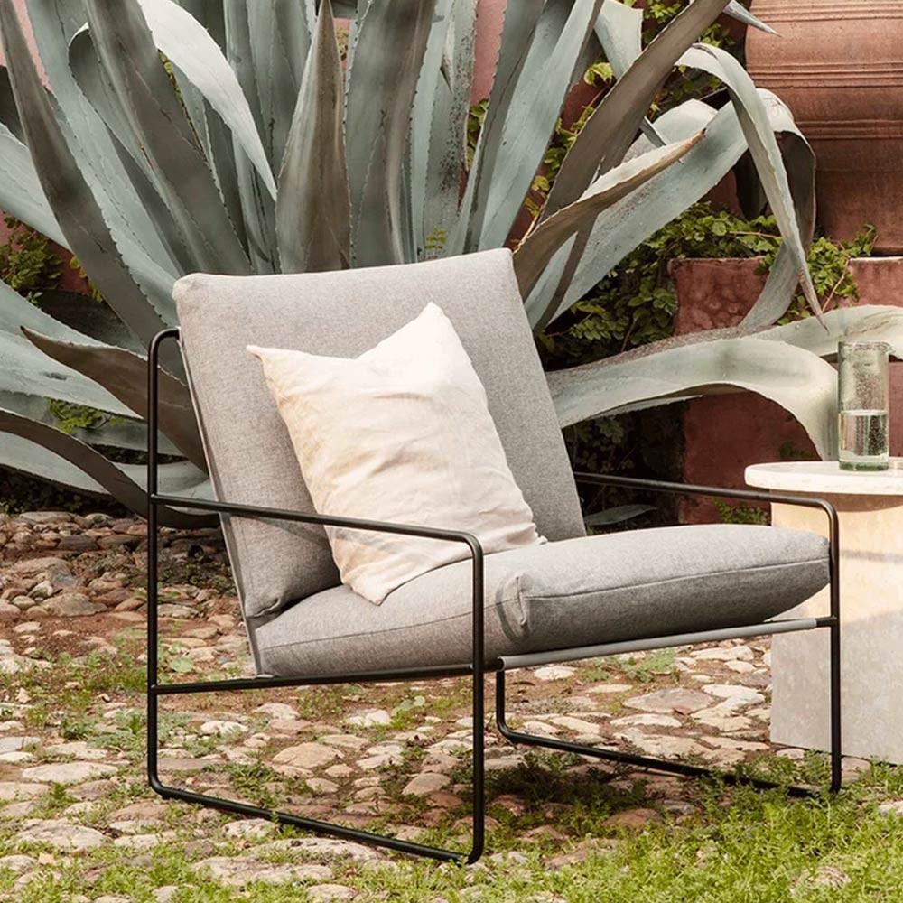 Der Sessel Desert ist ein von Ferm Living entworfener Sessel. Mit seinem leichten Stahlrahmen und seinen zwei bequemen Kissen kann er leicht verschoben werden, um die Gartenmöbel nach Ihren Wünschen zu gestalten. Er eignet sich perfekt, um ein Buch zu lesen oder einen ruhigen Moment im Freien zu genießen, allein oder zu mehreren. Dank seines rostfreien Stahlrahmens und seines fleckenresistenten Stoffes ist der Sessel Desert für eine lange Lebensdauer konzipiert.