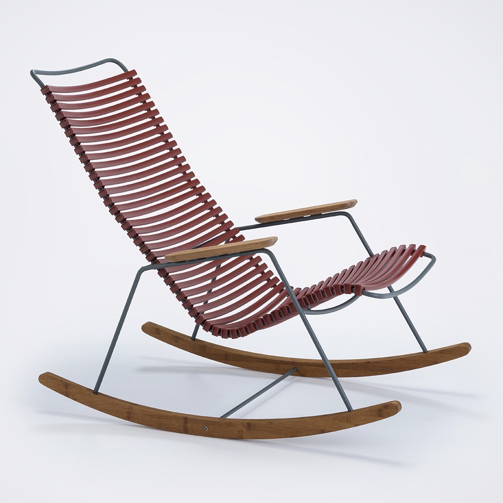 Dieser hübsche Click Schaukelstuhl, entworfen von Henrik Pedersen für Houe, ist ein perfektes Produkt, um Ihren Garten auf die schönste Art und Weise einzurichten. Mit seiner pulverbeschichteten grauen Metallstruktur, seinen oben aufgeklipsten breiten Paprika-Kunststofflamellen sowie seinen Bambus-Armlehnen und -Gleitern ist dieser Stuhl leicht und Design. Mit diesem Schaukelstuhl können Sie es sich mit der Gewissheit bequem machen, dass Sie es sich gut gehen lassen können. Dieser Click-Sitz ist ideal für Ihren Außenbereich und findet dank seines schlanken und modernen Aussehens leicht seinen Platz.