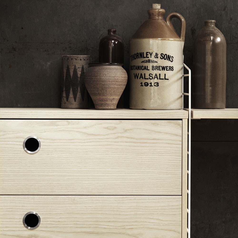 Die hölzerne Kommode mit Schubladen kann in wenigen einfachen Schritten in ein string®-Regalsystem integriert werden.
