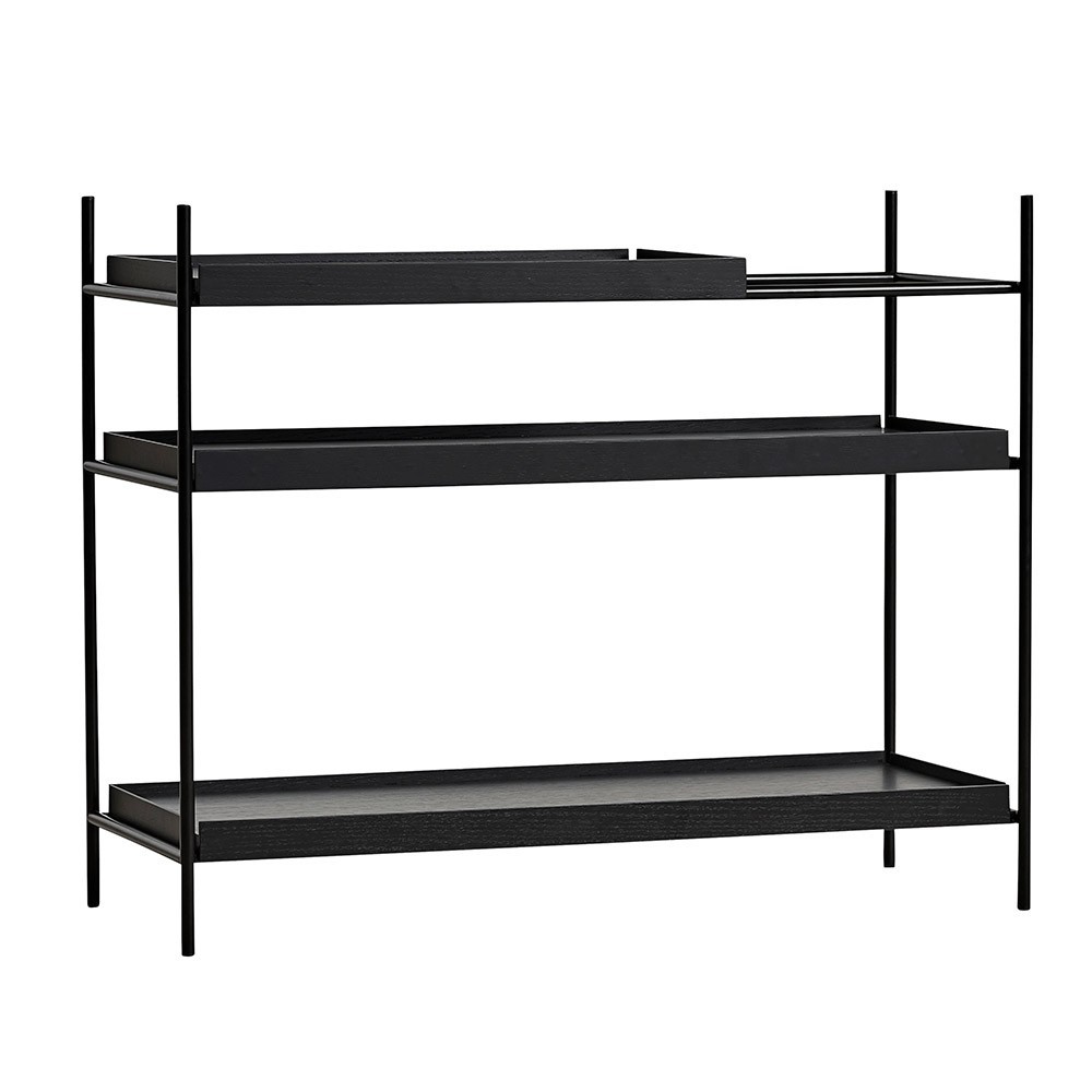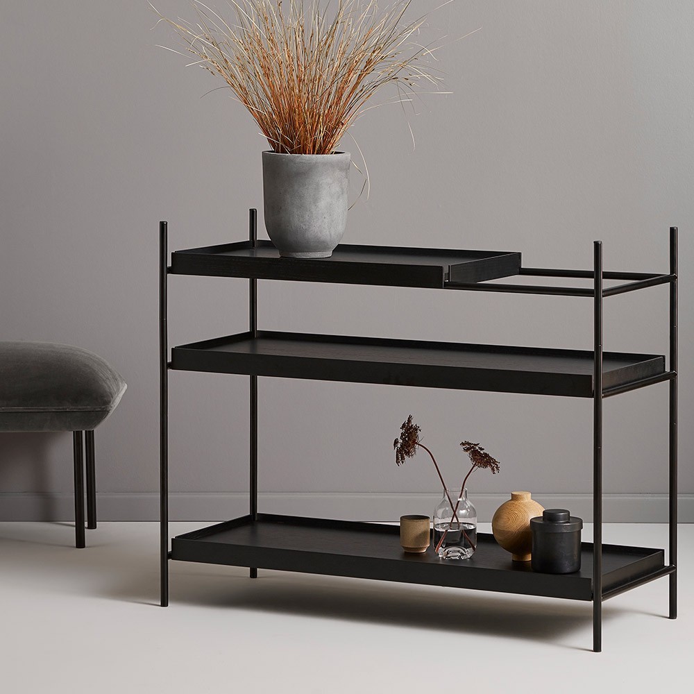 Das niedrige Regal von Tablett 2 ist japanisch mit seinem eleganten Ausdruck und deutsch mit seiner akribischen und soliden Struktur. Leere Räume im Regalsystem werden durch Verschieben des kleinen Verdecks geschaffen, wodurch größere Gegenstände im offenen Raum platziert werden können. Die unterschiedlichen Regalanordnungen machen das Regalsystem lebendig und persönlich.