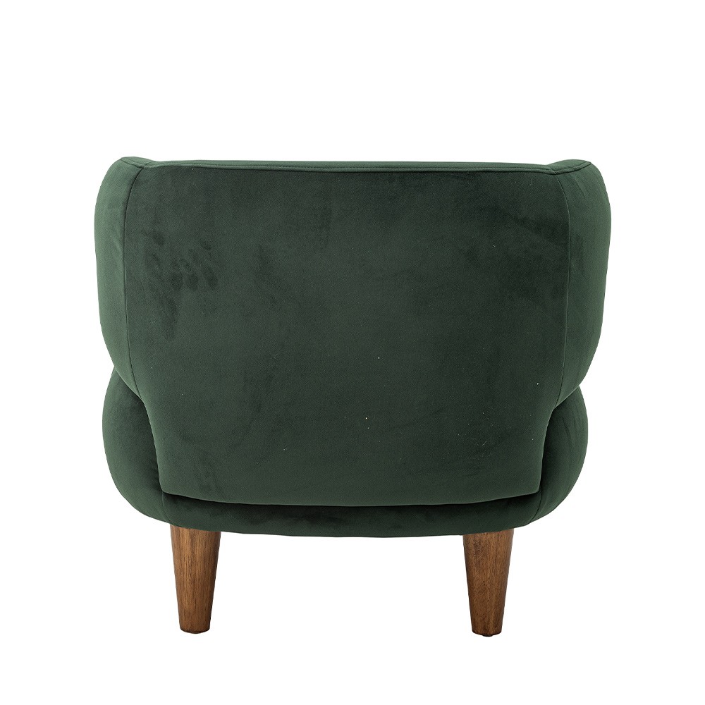 Collection ist ein kompakter, eleganter Stuhl, der jedem Raum Komfort und Eleganz verleiht. Mit seiner umhüllenden Form schafft er eine warme Atmosphäre. Der Stuhl ist mit einem wunderschönen dunkelgrünen Samtstoff bezogen, der einen luxuriösen Touch verleiht, während die Beine aus braun gebeiztem Kautschukholz für ein natürliches Aussehen sorgen. Perfekt für das Wohnzimmer oder eine Ecke, in der Sie sich entspannen oder ein Buch lesen können.