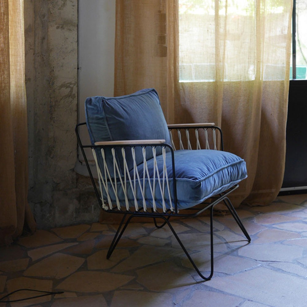 Dank seines großzügigen Sitzes und seiner großen weichen Rückenlehne erinnern die weißen Baumwollseile an Segelboote, während der celadonblaue Samt seiner Kissen an das Mittelmeer erinnert, die Wiege des französischen Riviera-Geistes, den es ausstrahlt.