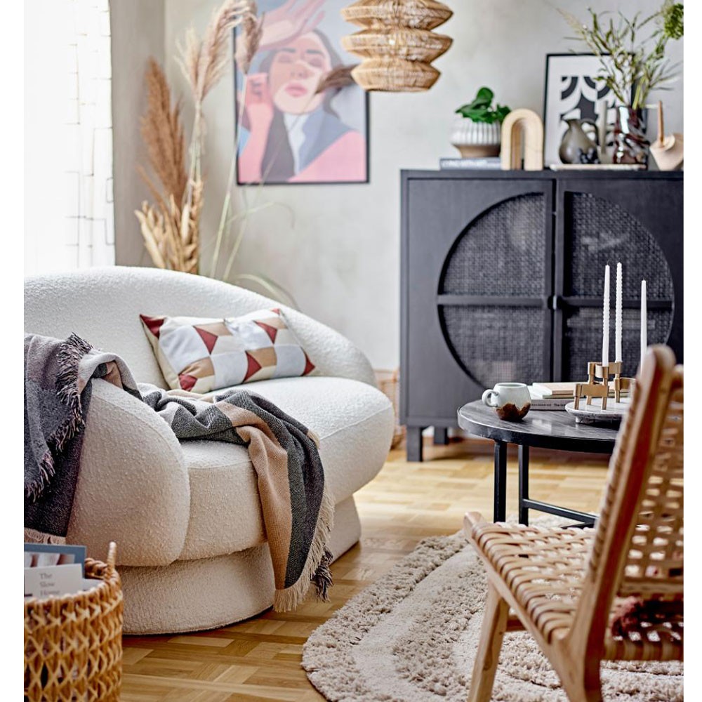 Entdecken Sie den Trento-Schrank von Bloomingville, ein geräumiges Holzmöbel mit einer Rattantür in einem warmen Schwarz. Der Schrank hat im Inneren zwei feste Regale und einen Magnetverschluss.
