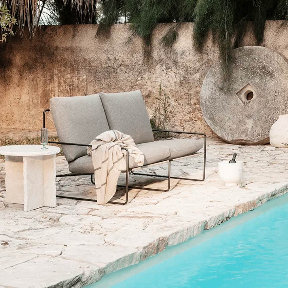 Das Sofa Desert ist ein Outdoor-Sofa, das von Ferm Living entworfen wurde. Mit seinem leichten Stahlrahmen und den bequemen Kissen kann es leicht bewegt werden, um die Gartenmöbel nach Ihren Wünschen zu gestalten. Sie eignet sich perfekt, um ein Buch zu lesen, einen ruhigen Moment allein oder mit mehreren Personen zu genießen. Dank des rostfreien Stahlrahmens und des fleckenresistenten Stoffes ist das Desert-Sofa für eine lange Lebensdauer konzipiert.