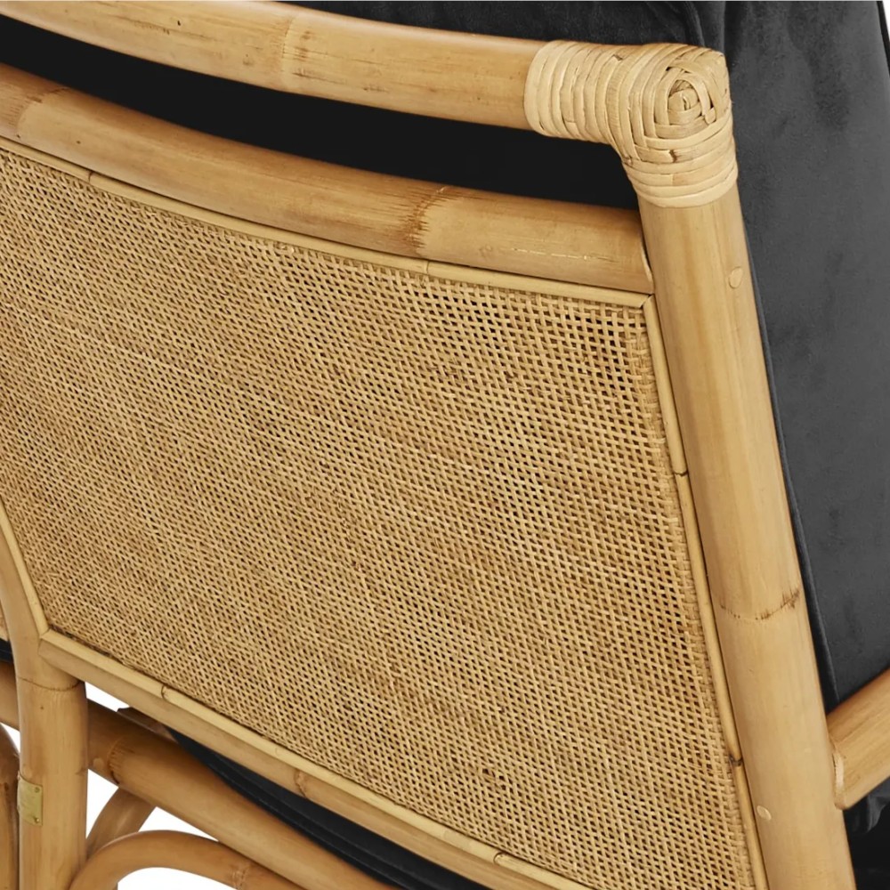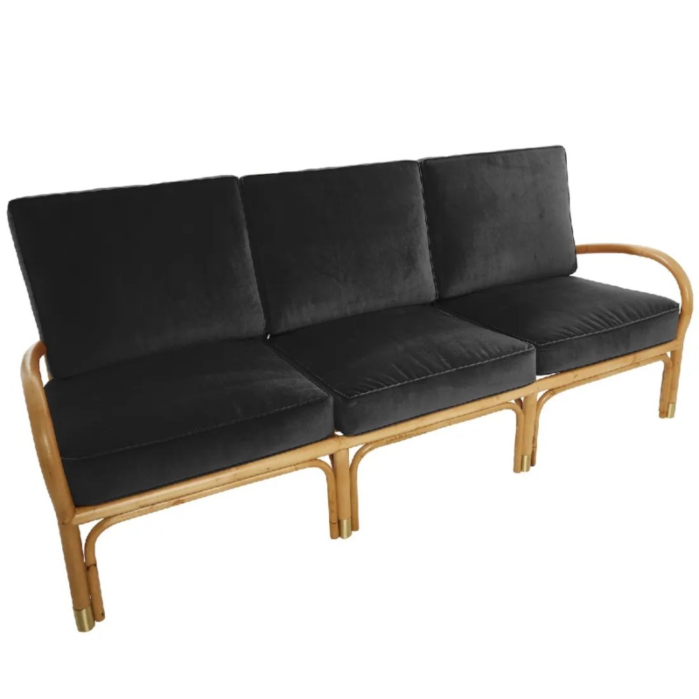 Jedes Detail spiegelt das Streben nach Komfort und Qualität wider: hochwertige Bultex-Kissen, die in Frankreich hergestellt werden, abnehmbare Samtbezüge, doppeltes Rohrgeflecht an den Rückenlehnen, Messingbeschläge... Ein subtiler und raffinierter Hauch von Natürlichkeit für einen modern interpretierten Vintage-Geist.