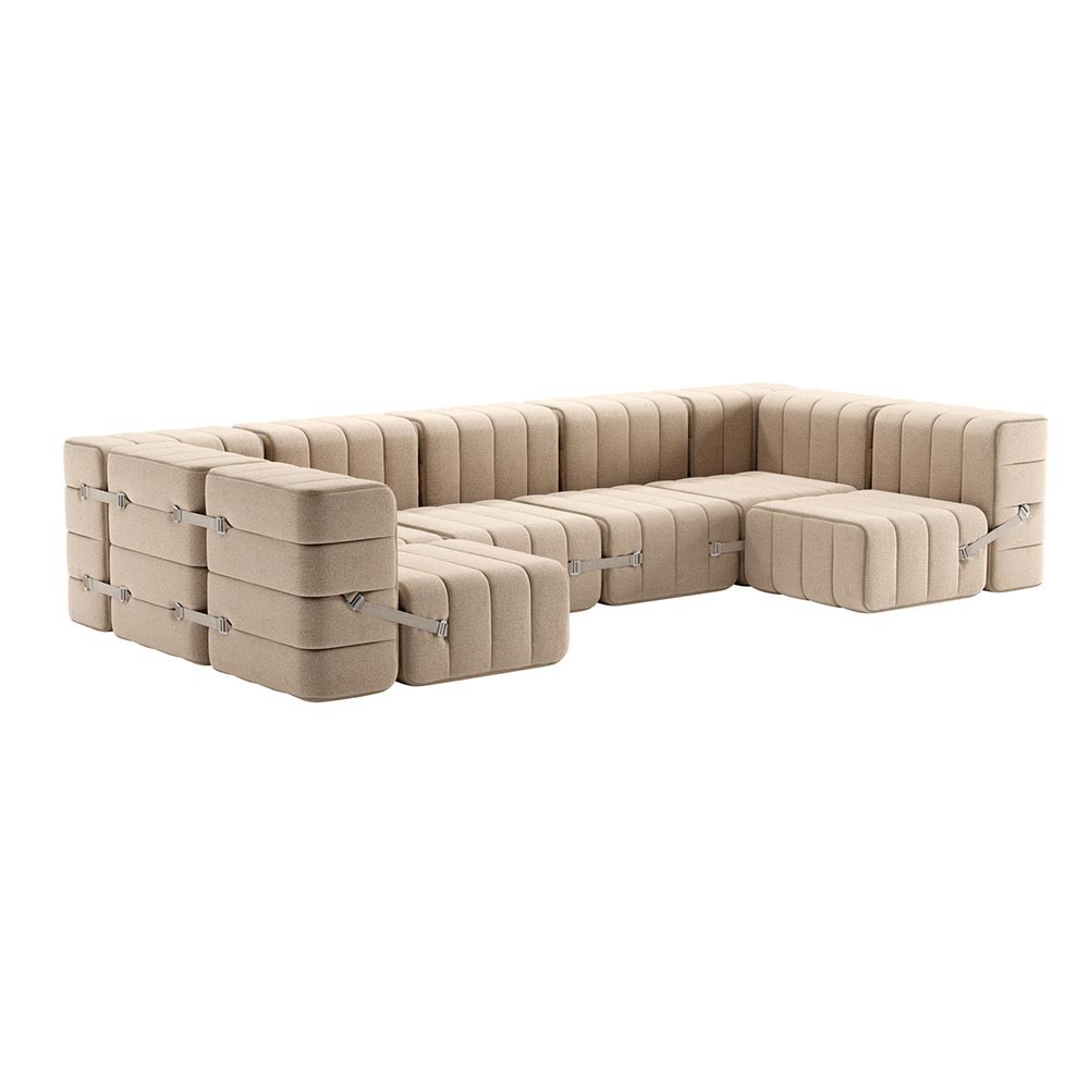 Das Curt 15-Modul-Set kann für sich allein stehen und zu einem asymmetrischen Sessel, einer Bank, einem Loungesessel oder einzelnen kleinen Hockern werden. Ein paar einzelne Module reichen aus, um sich auf sehr einfache Weise in ein äußerst flexibles und modulares Sofasystem zu verwandeln: Der Satz von 15 Curt-Modulen besteht aus verstellbaren Trägern, mit denen Sie endlos kreieren können.