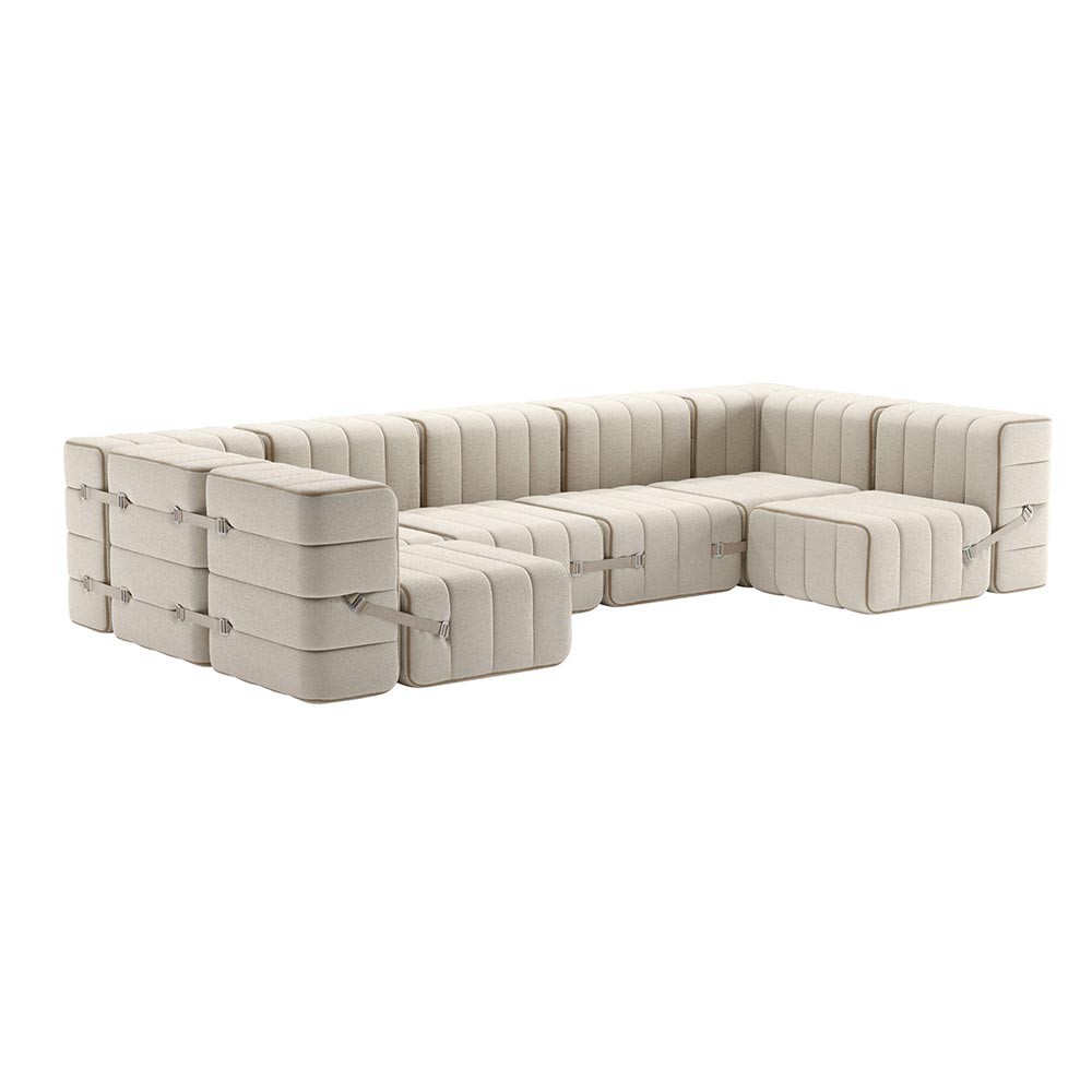 Das Curt 15-Modul-Set kann für sich allein stehen und zu einem asymmetrischen Sessel, einer Bank, einem Loungesessel oder einzelnen kleinen Hockern werden. Ein paar einzelne Module reichen aus, um sich auf sehr einfache Weise in ein äußerst flexibles und modulares Sofasystem zu verwandeln: Der Satz von 15 Curt-Modulen besteht aus verstellbaren Trägern, mit denen Sie endlos kreieren können.