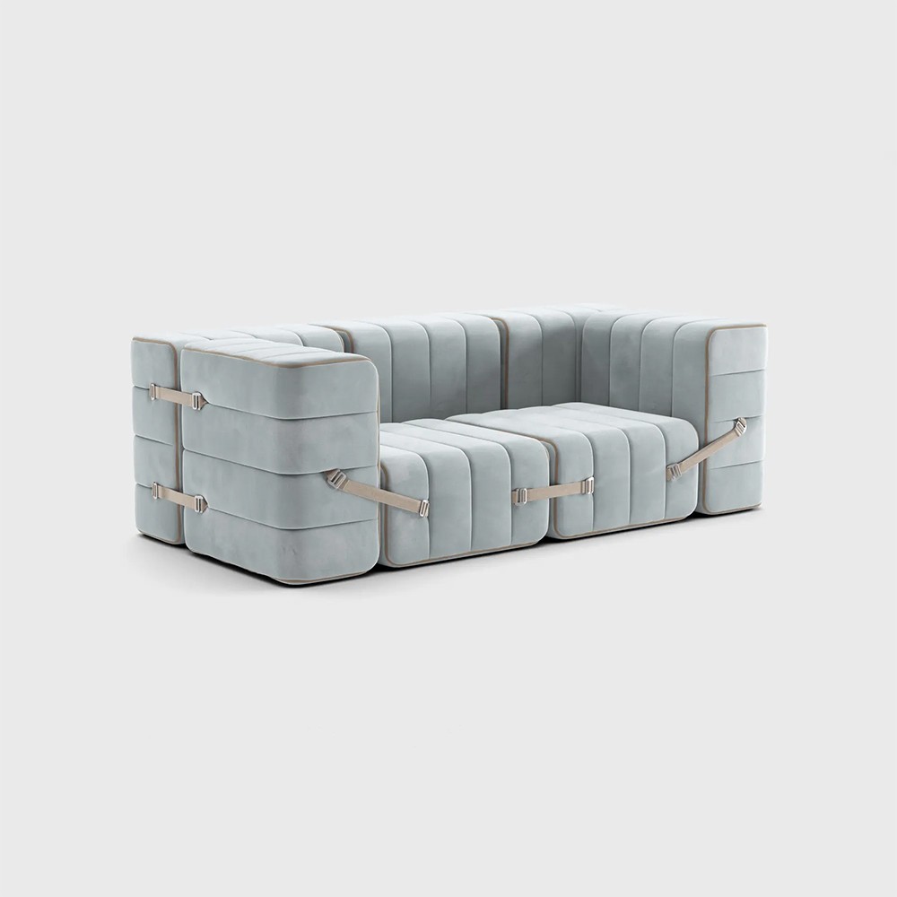 Das Curt-Set mit 7 Modulen kann für sich allein stehen und zu einem asymmetrischen Sessel, einer Bank, einem Loungesessel oder einzelnen kleinen Hockern werden. Ein paar einzelne Module reichen aus, um sich auf sehr einfache Weise in ein äußerst flexibles und modulares Sofasystem zu verwandeln: Der Satz von 7 Curt-Modulen besteht aus verstellbaren Trägern, mit denen Sie endlos kreieren können.