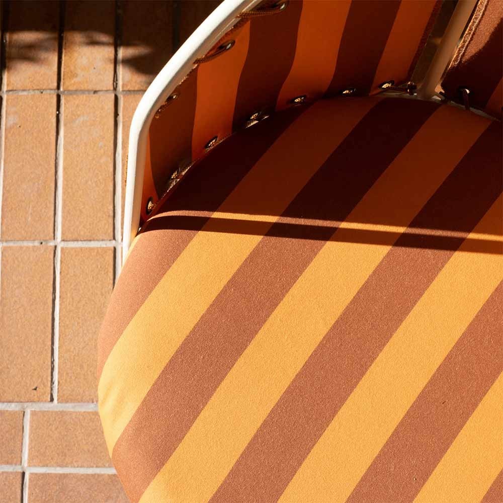 Mit seinem gestreiften Outdoor-Stoff, der Brick/Braun-Streifen für einen erdigen Touch oder Weiß/Grün für eine frühlingshafte Frische bietet, lädt der Palmer Chair dazu ein, die Szenografie Ihrer Innen- und Außenräume neu zu überdenken.