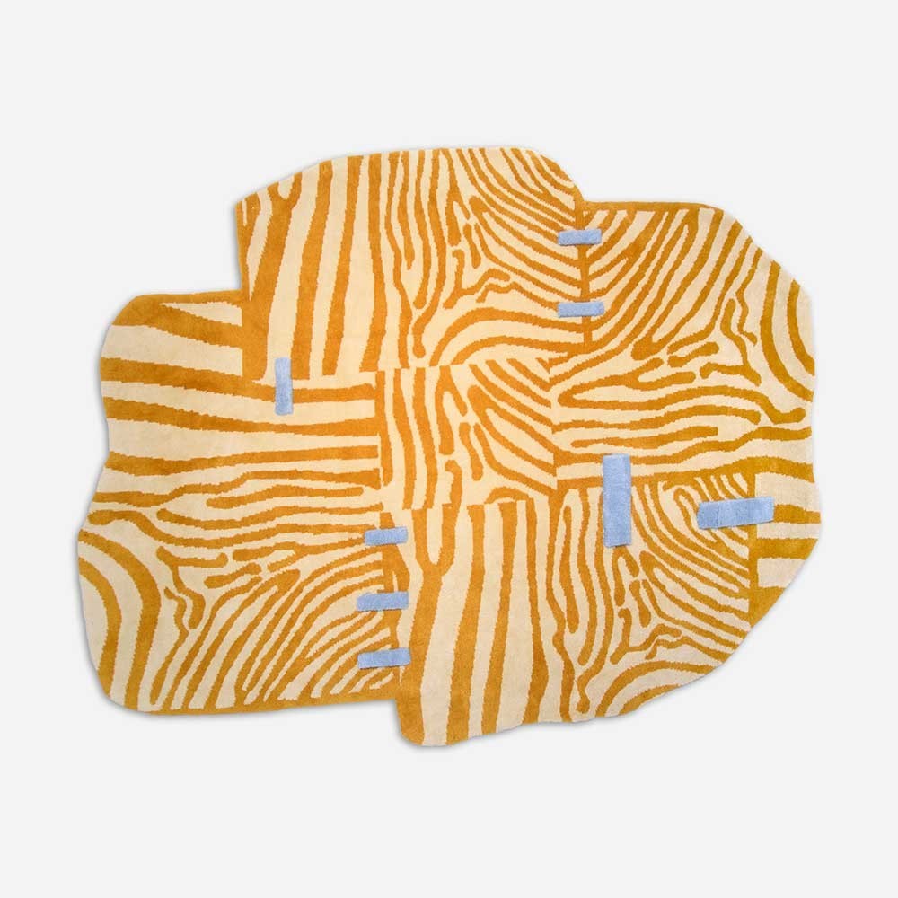 Dieser Teppich hat ein komplexes, von der Maserung von Holz inspiriertes Muster in warmen Goldtönen, das mit sanften Blautönen kontrastiert, die an Nähte erinnern. Seine unregelmäßige Form und die harmonische Mischung aus abstrakten Formen verleihen ihm eine dynamische, handgefertigte Ästhetik.