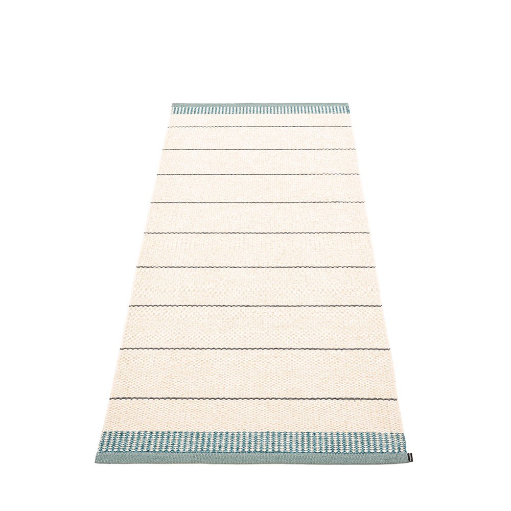 Produziert in Dalarna, Schweden. Auf einem traditionellen Webstuhl mit Holzshuttles gewebt. Eine sehr praktische und pflegeleichte PVC-Matte, hergestellt in Schweden. Gepresste Kunststoffbänder für mehr Festigkeit und Haltbarkeit des Produkts mit dem Pappelina-Logo an beiden Kanten.