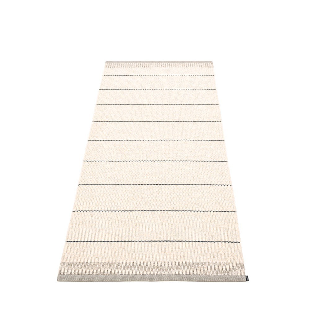 Produziert in Dalarna, Schweden. Auf einem traditionellen Webstuhl mit Holzshuttles gewebt. Eine sehr praktische und pflegeleichte PVC-Matte, hergestellt in Schweden. Gepresste Kunststoffbänder für mehr Festigkeit und Haltbarkeit des Produkts mit dem Pappelina-Logo an beiden Kanten.