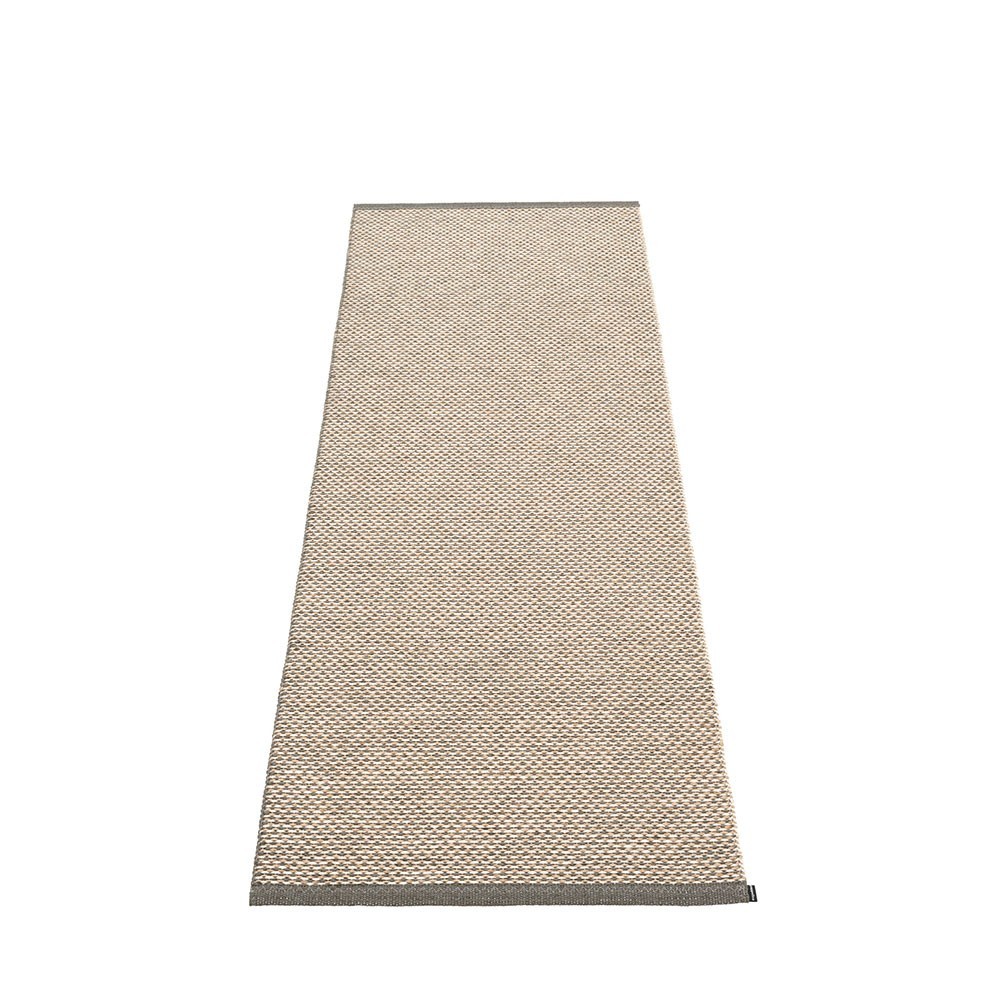 Produziert in Dalarna, Schweden. Auf einem traditionellen Webstuhl mit Holzshuttles gewebt. Eine sehr praktische und pflegeleichte PVC-Matte, hergestellt in Schweden. Gepresste Kunststoffbänder für mehr Festigkeit und Haltbarkeit des Produkts mit dem Pappelina-Logo an beiden Kanten.