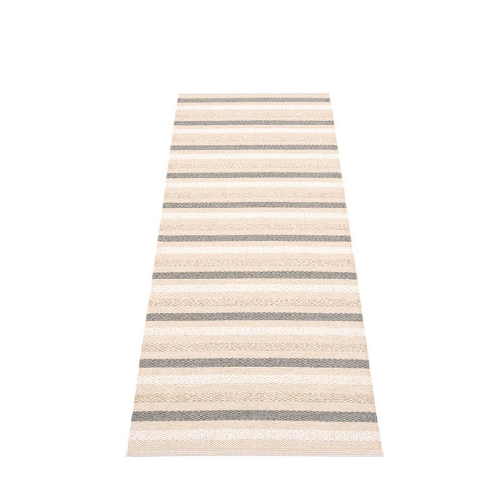 Produziert in Dalarna, Schweden. Auf einem traditionellen Webstuhl mit Holzshuttles gewebt. Eine sehr praktische und pflegeleichte PVC-Matte, hergestellt in Schweden. Gepresste Kunststoffbänder für mehr Festigkeit und Haltbarkeit des Produkts mit dem Pappelina-Logo an beiden Kanten.