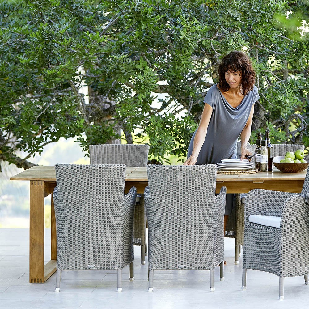 Cane-line ist eine dänische Designermarke, die uns sowohl Außen- als auch Innenmöbel anbietet. Um Ihnen die beste Lebensqualität im Außen- und Innenbereich zu bieten, legt Cane-line Wert auf die Qualität der verwendeten Materialien und den Komfort der Möbel. Cane-line hat diesen Esstisch aus Endlos-Teakholz entworfen, der sich ideal für Ihre Abende, Aperitifs und Mahlzeiten eignet. Der Endless Tisch ist aus zertifiziertem Teakholz gefertigt und bietet ein natürliches und lang anhaltendes Aussehen. Teak ist ein ölreiches Holz, ideal für den Außenbereich. Diese Stühle sind langlebig, praktisch und stilvoll. Dieser Tisch passt perfekt zu den Stühlen aus der gleichen Kollektion.