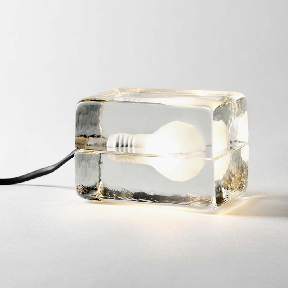 Wie eine Glühbirne in einem Eisblock streut diese Designer-Tischlampe von Harri Koskinen für das Design House Stockholm ihr Licht auf atypische und überraschende Weise. Ein echtes Stück Eis, das auf einem Tisch oder Schreibtisch eine sehr zeitgemäße dekorative Atmosphäre bietet.