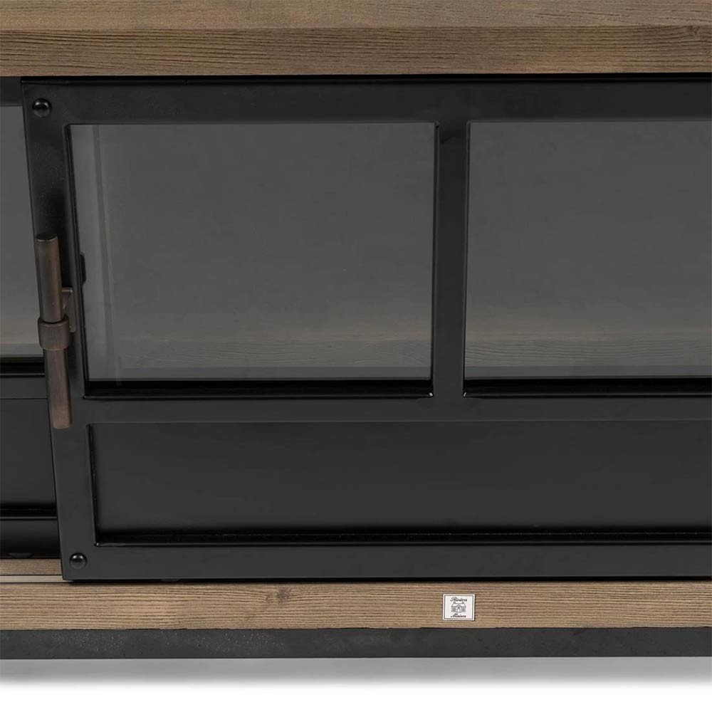 Fügen Sie Ihrer Einrichtung mit dem Hoxton TV-Möbel ein cooles und modernes Möbelstück hinzu. Dieses geräumige Möbelstück mischt robustes, natürlich aussehendes Eschenholz mit schwarzem Metall für diesen rohen und robusten Touch. Das Lowboard verfügt über drei Glasschiebetüren, hinter denen Sie z. B. Ihre elektronischen Geräte aufbewahren können.