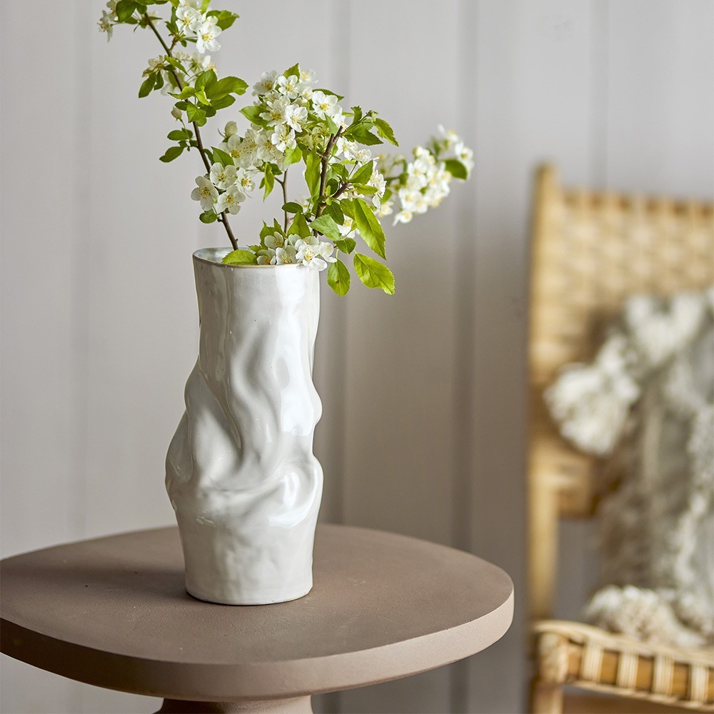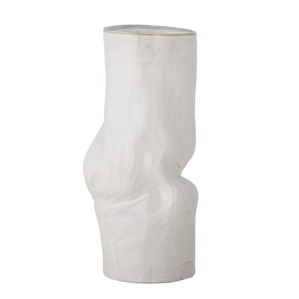 Die Vase Araba von Bloomingville aus Steingut ist mit einer weißen reaktiven Glasur überzogen. Die Vase hat ein verzerrtes Aussehen. Aufgrund der Art der Glasur und der handwerklichen Technik kann es zu Abweichungen kommen.