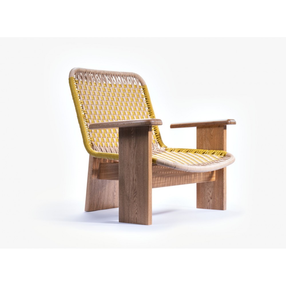 Jeder Stuhl wird in Santa Marta an der kolumbianischen Karibikküste von lokalen Handwerkern hergestellt. Das Flechtwerk besteht aus recycelten PVC-Seilen, die sorgfältig um einen Rahmen aus pulverbeschichtetem Stahlrohr gewickelt werden. Das Ergebnis ist ein strapazierfähiger, ethischer und visuell beeindruckender Stuhl.