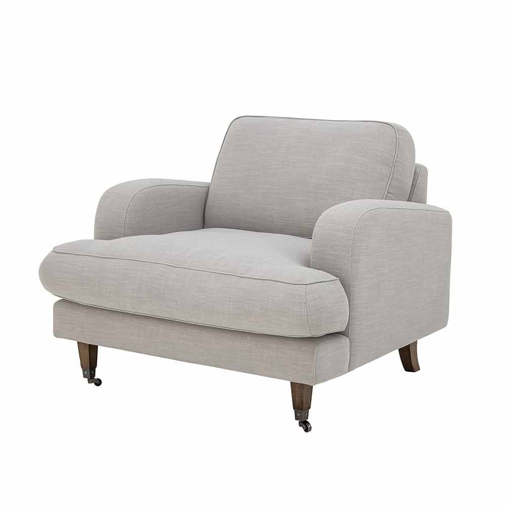 The Augusta lounge chair from Creative Collection offers a blend of elegance and comfort for any living space. This comfortable armchair has a flat woven linen look in a subtle natural hue, composed of 85% polyester and 15% linen. It has wheels on the front legs, making the Augusta lounge chair easily mobile and practical for any environment.