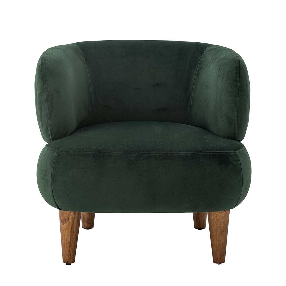 Collection is a compact, elegant chair that brings comfort and style to any room. With its wrap-around shape, it creates a warm atmosphere. The chair is upholstered in a beautiful dark green velvet fabric, adding a luxurious touch, while the brown-stained rubber wood legs offer a natural look. Perfect for the living room or a corner where you can relax or read a book.