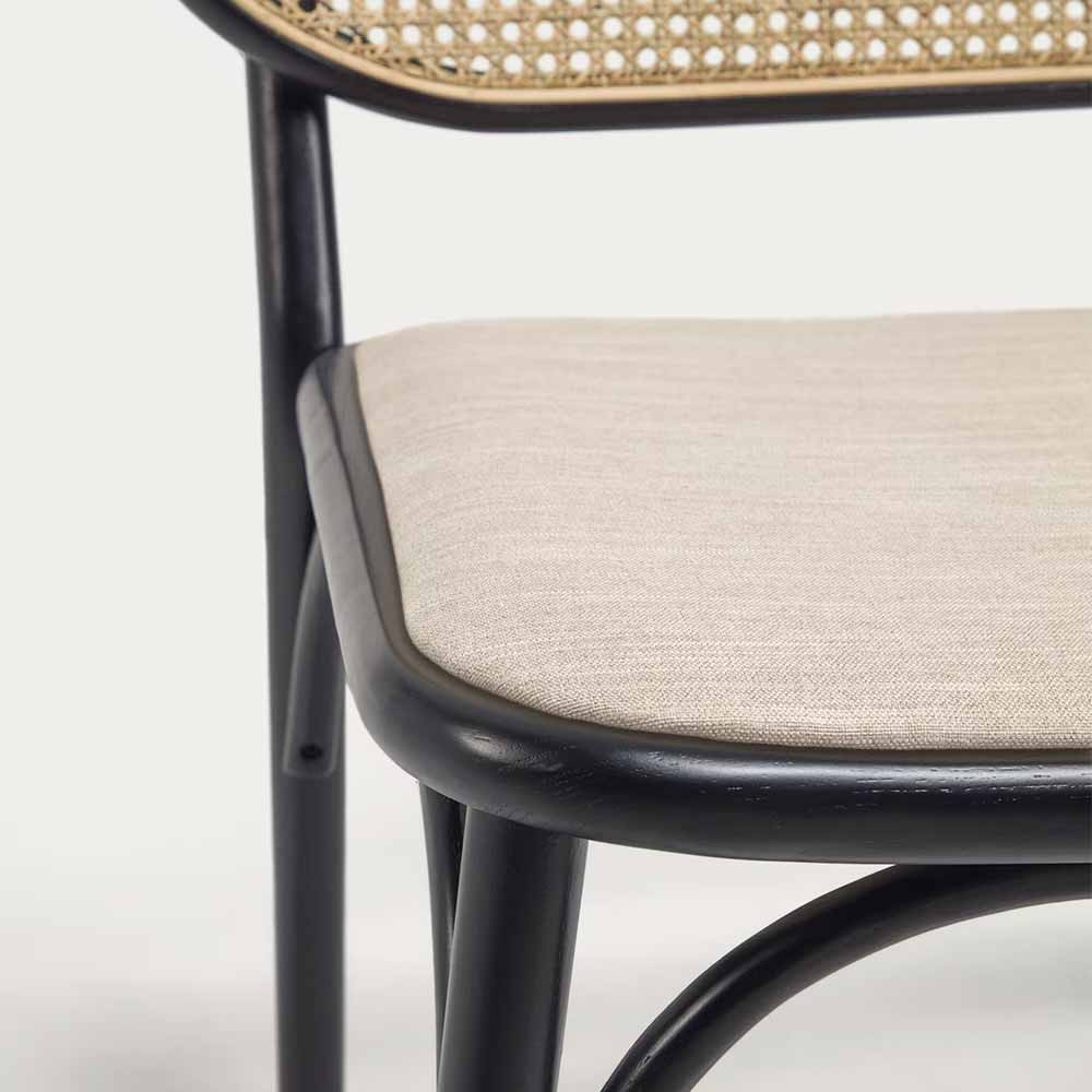 The Doriane armchair is a handcrafted piece made from oak wood and hand-woven rattan, with water-repellent linen-effect upholstery. Perfect for a trendy living room with a natural look thanks to its revisited classic design.