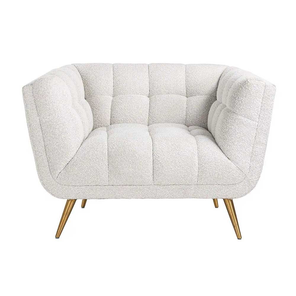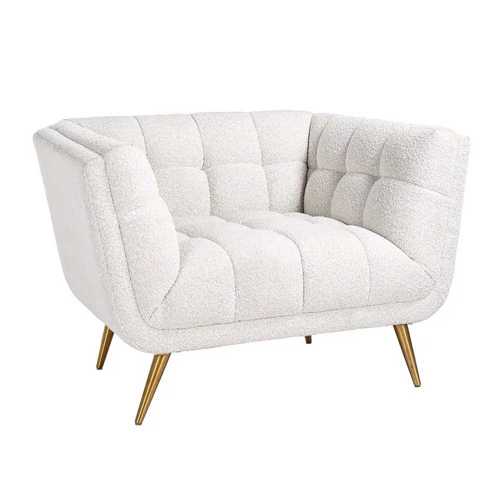 The Huxley armchair, dressed in sumptuous white bouclé fabric and featuring a chic gold base, seduces with its ultra-comfortable seat and enveloping shape, creating an elegant and warm atmosphere in your home.