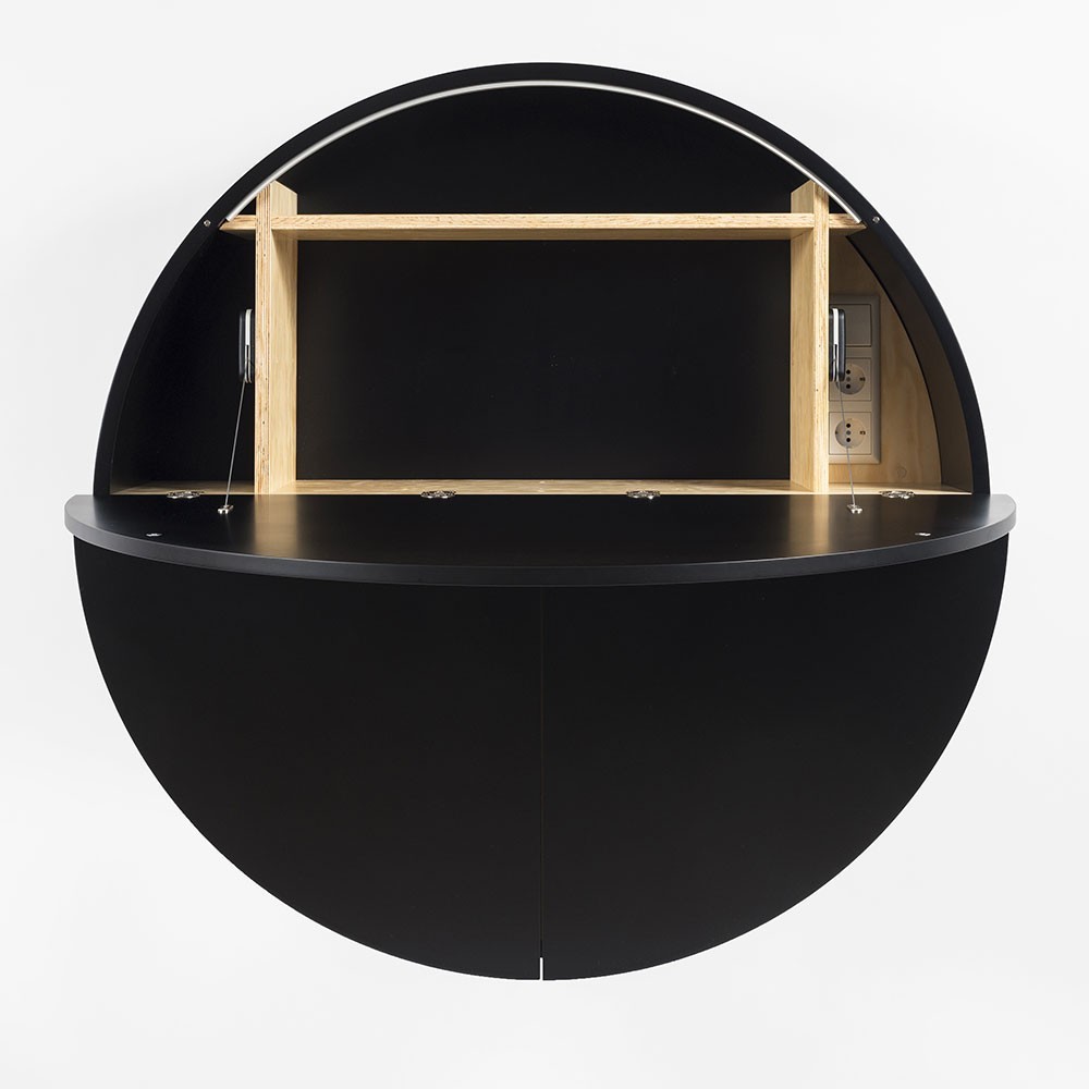 The Pill wall desk black works fixed to a wall and can instantly transform into a fully-functional working place, a dressing table, or even a bar! The shelving system inside is designed with the idea to allow the user to change and adapt it easily: it can fit a laptop, standard files, catalogues, books or any other personal belongings. Furthermore, the Pill comes equipped with sockets and the option of integrating LED lights. The materials and the fittings used into manufacturing are providing a reliable desk transformation and tabletop stability. Pill suits perfectly to every kind of interior, enabling you to have a hidden space for your items.