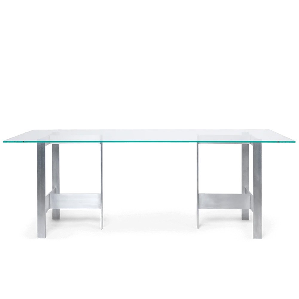 Named after the Danish word for "warehouse", the Lager dining table pays homage to classic utilitarian forms. Made from aluminum, the table embodies a clean contemporary aesthetic reminiscent of brutalist design principles. Featuring a raw satin finish, the aluminum legs enhance its clean, angular shape while providing sturdy support. The elegant glass top contrasts subtly with its base, offering versatility to serve a variety of spaces and occasions. The table's versatile design makes it suitable for kitchens, dining rooms and offices.