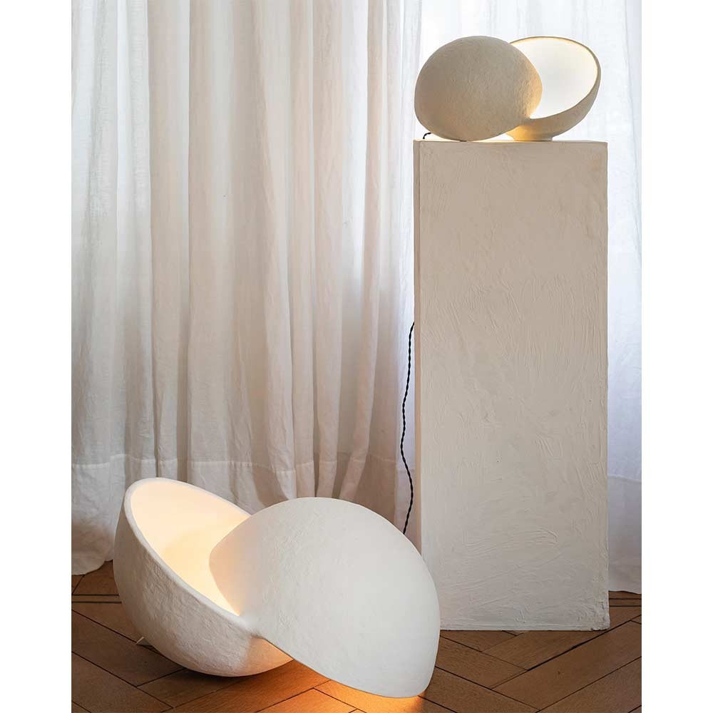 The designer, Marie Michielssen, is known for her unique, handcrafted creations, which are often inspired by nature. This off-white floor lamp made of papier-mâché is no exception, and displays a particularly artisanal character.