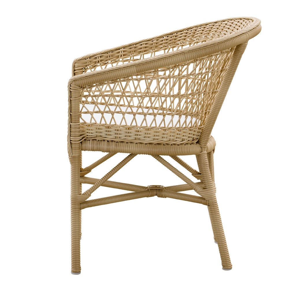 Emma collection of armchairs and sofas by Sika-design in natural and taupe rattan for outdoor use. Create a cozy and warm atmosphere with this beautiful collection of furniture for outdoor use. All the products of the collection are made with an aluminum structure and synthetic fiber taupe or natural (polyethylene).