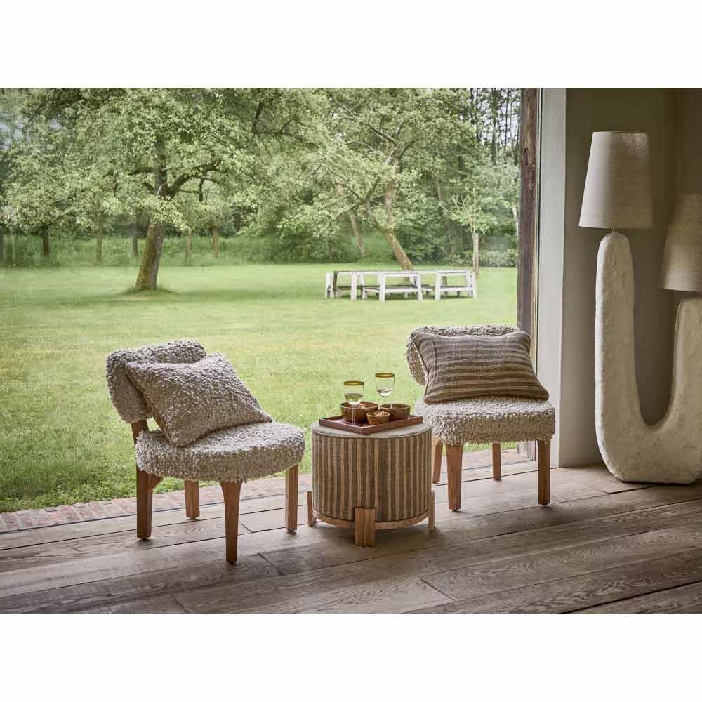 Brindisi, an ethnic collection with handmade details. The hand-embroidered cushions are filled with feathers, making them very soft to the touch. They also feature a dual character: one side embroidered and the other hand-painted. The textile on the patterned pouf is also hand-painted. And for those who prefer to remain subtle, we offer a neutral set entirely covered in a soft beige curly fabric. The Brindisi collection brings a harmonious blend of cultural influences and craftsmanship into your home.