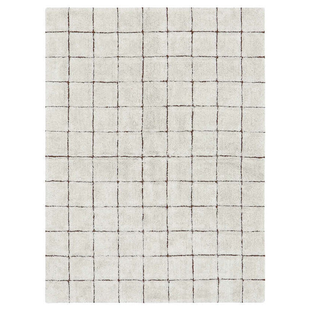 Discover the washable Mosaic rug by Lorena Canals. This rug features a plain, natural-colored mosaic pattern on a caramel-brown canvas base left partially bare to imitate the joints.