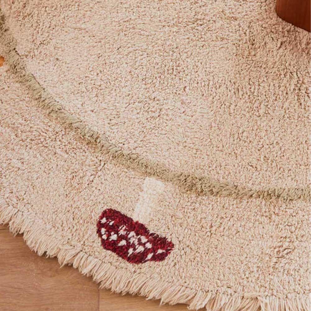 A soft cotton rug featuring two charming mushrooms - one large, one small. It's woven from the softest natural cotton in shades of Chestnut and Olive. Rows of slightly longer tufts and braids added at the bottom add extra charm to this delightful rug.