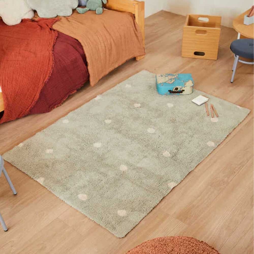 A soft, plush cotton rug with a timeless polka dot pattern. Tufted in extra high-density soft cotton pile, the Mini Dot rug is available in three color combinations: Chestnut with natural dots, Pink with natural dots and Sage Blue with natural dots.
