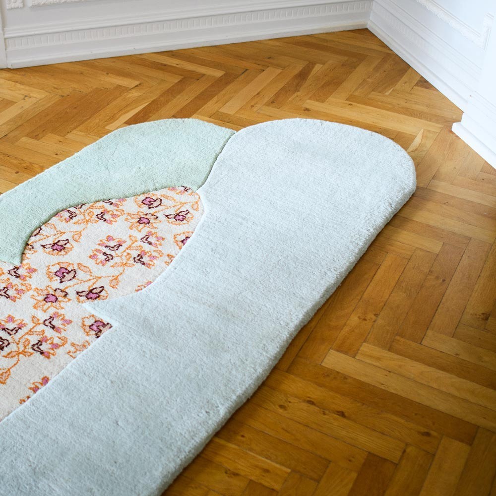 The FLORA rug features a balanced composition of muted greens and soft pastels, contrasted by delicate floral motifs in warm tones. Its asymmetrical, sculptural shape reflects the gentle curves of leaves and petals, creating a visually dynamic piece that is both natural and artistic.