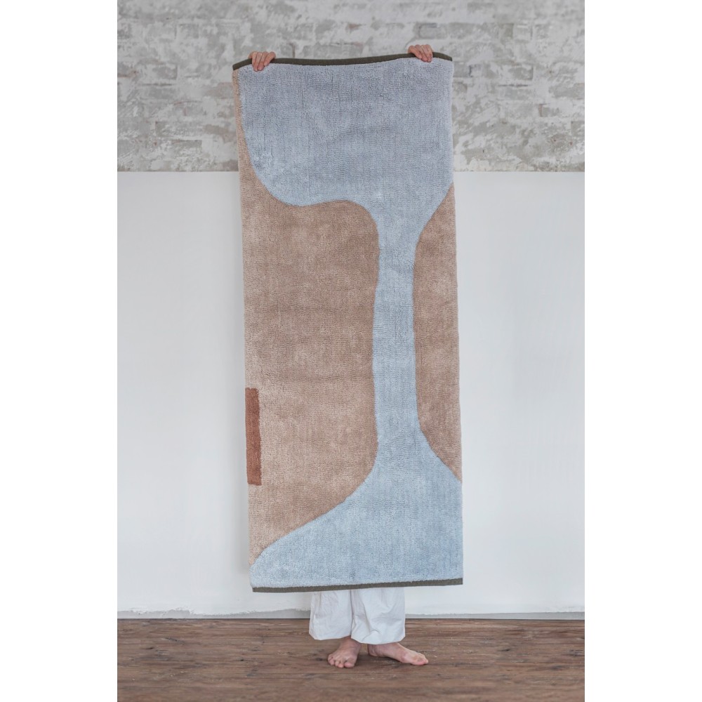 With its non-slip latex backing, this rug is also ideal for the bathroom. A unique signature block in contrasting shapes and colors breaks up the organic pattern and adds a playful touch.