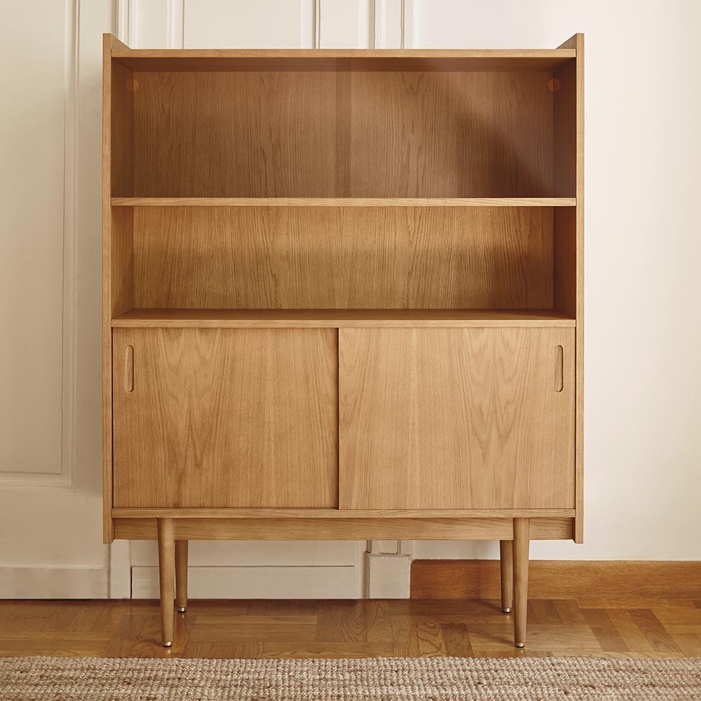 The 1050 High Buffet is an oak wood storage unit designed by 366 concept. In an office, bedroom or living room, this functional piece will become your favorite storage solution. Available in several wood finishes, this furniture with its clean lines and elegant look will fit perfectly into your interior. With its two large shelves and two sliding doors, this practical sideboard will allow you to store everyday objects, art objects, books and other knickknacks...