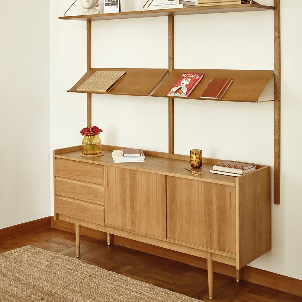 Discover the 1050 long sideboard, oak wood storage furniture designed by the brand 366 concept. This functional low sideboard has a sleek design and a timeless silhouette, which fits perfectly into a Scandinavian aesthetic. In a living room, this sideboard can be used as a TV stand. With its 3 drawers, 2 shelves and its beautiful sliding door, this practical sideboard will allow you to store everyday objects, art objects, books and other knickknacks...