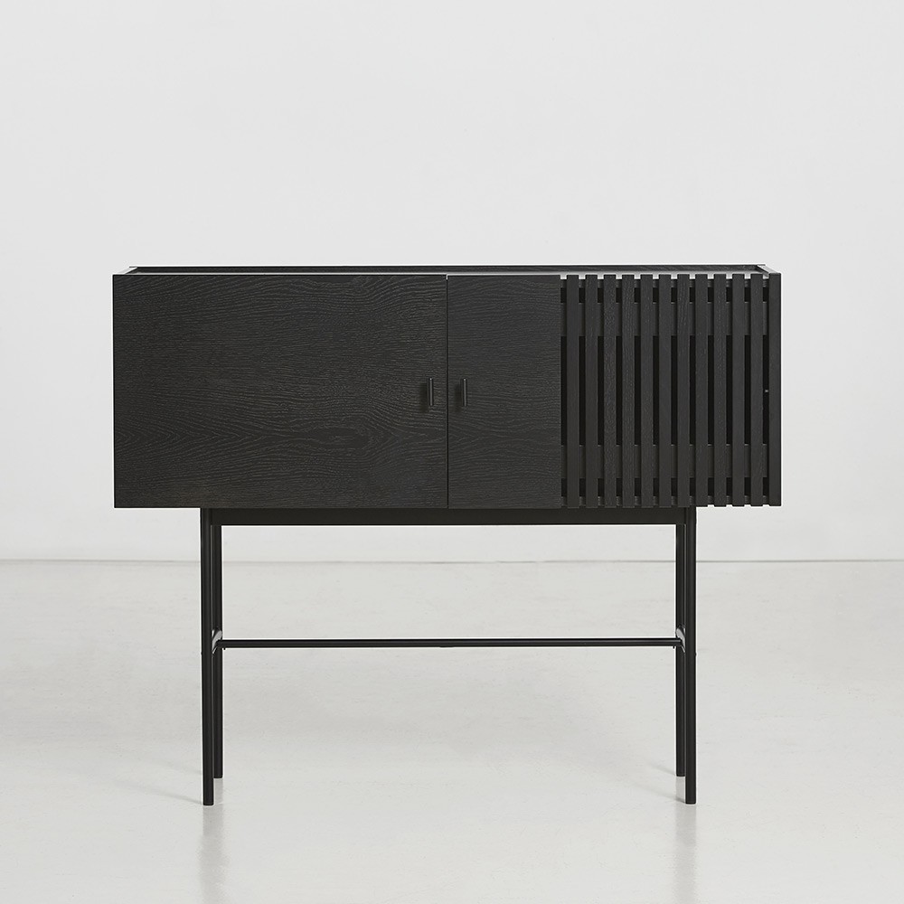 The series of sideboards is inspired by the wooden slate cladding found in modern architecture. With its geometric shape and horizontal slates, Array creates a strong visual effect from catching both light and shadow in the depth of the slates. The illusion of transparency is intended to create a feeling of growing curiosity as you get a glimpse of what is hidden behind the closed doors. The sleek legs lift the sideboards from the ground creating an elegant contrast between the solid wooden cabinet on top and the thin metal construction underneath.