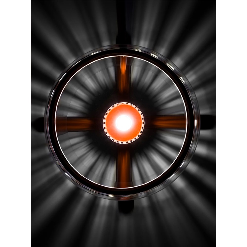 The transparency of the glass beautifully reflects the warmth of the light, while the small slits project changing light and shadows across the room.