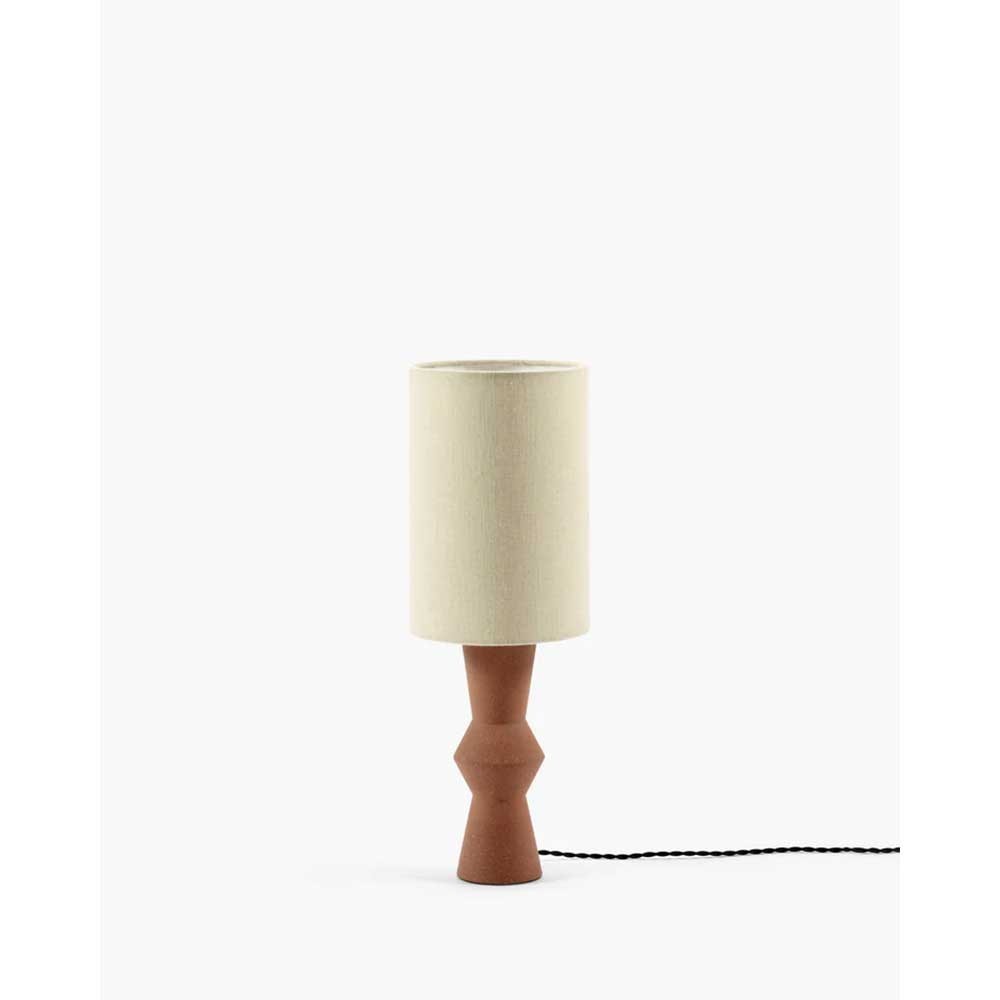 Designed by Marie Michielssen, the Marie-Ann table lamp features a slender silhouette in reddish-brown terracotta clay, topped by a finely stretched linen shade. A delicate fabric-covered iron cord adds a touch of retro sophistication. The harmony of natural materials and clean lines gives it a sober, timeless elegance.